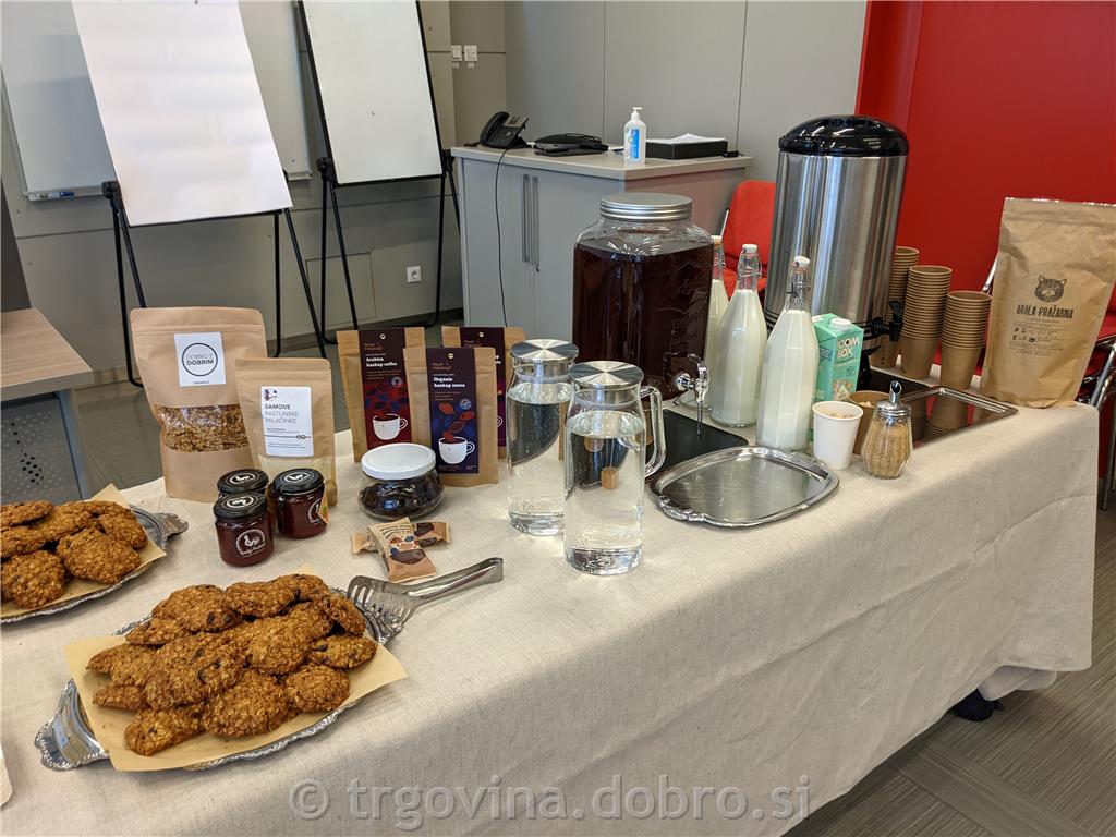 Odmor za kavo vsebuje 1,5 dl kave in 1 dl caja na osebo ter sladico po izbiri, ob kavi postrežemo slakdor in mleko. Za sladico po izbiri so na voljo domaci ovesni piškoti z brusnicami ali panna cotta z domaco marmelado ali jabolcni štrudelj, lahko vam pripravimo tudi vegansko sladico in sicer kokosovo panna cotto.